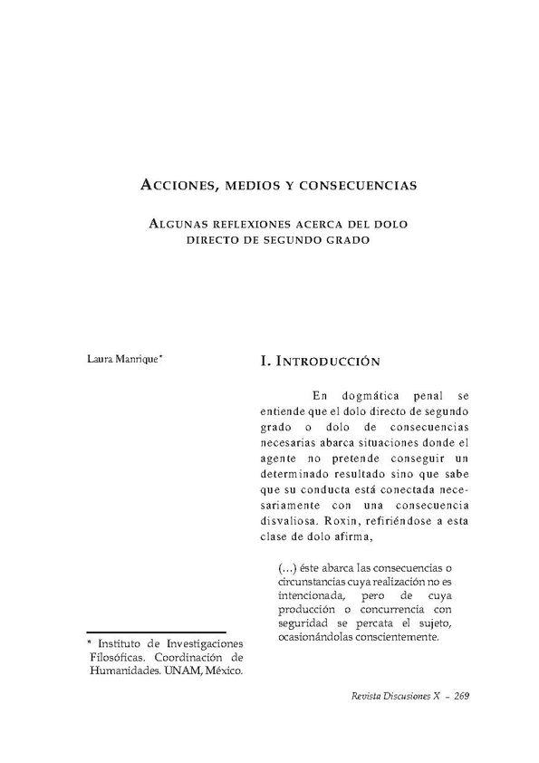 - Título: Acciones, medios y consecuencias. Algunas reflexiones acerca del dolo directo en segundo grado / Laura Manrique (Formato PDF)