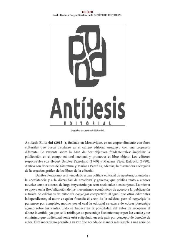 - Título: Antítesis Editorial (2013- ) [Semblanza] / Anahí Barboza Borges (Formato PDF)