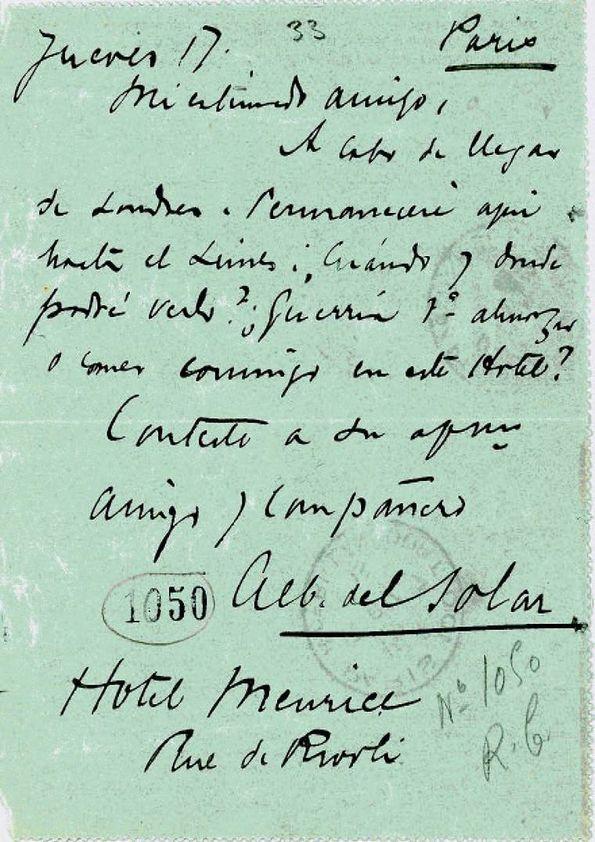 - Alcance y contenido: Jueves 17. Paris. Mi estimado amigo, Acabo de llegar de Londres. Permaneceré aquí hasta el Lunes. ¿Cuándo y donde podré verlo? ¿Querría Vd. almorzar o comer conmigo en este Hotel? Conteste a su afmo amigo y compañer