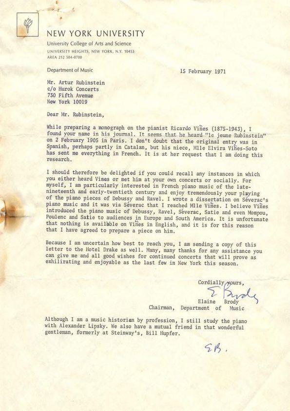 Carta dirigida a Arthur Rubinstein. Nueva York, 15-02-1971