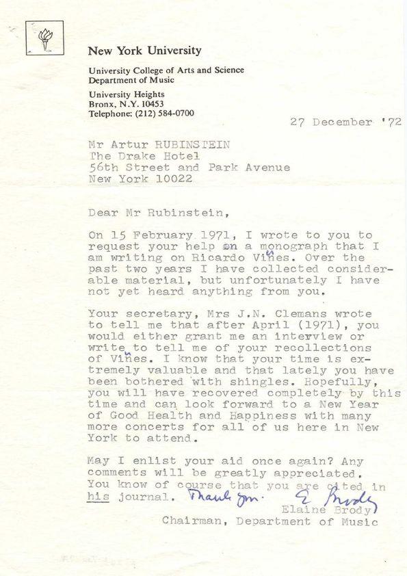 Carta dirigida a Arthur Rubinstein. Nueva York , 27-12-1972