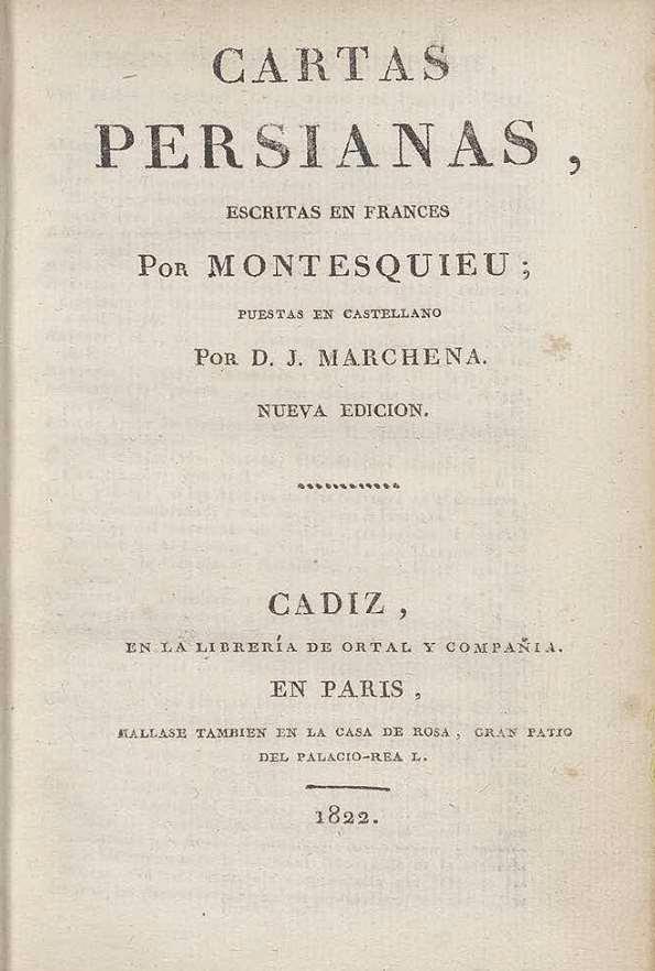- Título: Cartas persianas / escritas en francés por Montesquieu ; puestas en castellano por D. J. Marchena (Formato PDF)