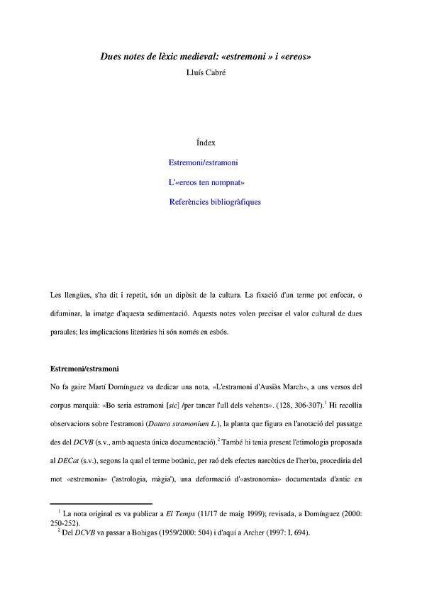 - Títol: Dues notes de lèxic medieval: «estremoni » i «ereos» / Lluís Cabré (Format PDF)