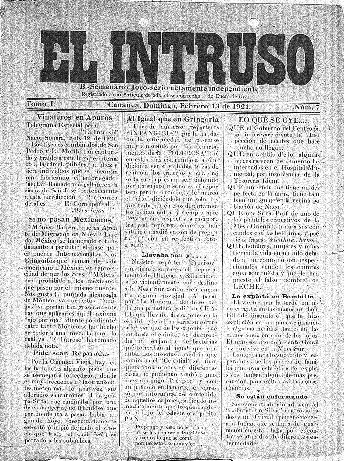 - Título: El intruso. Bi-Semanario Joco-serio netamente independiente. Tomo I, núm. 7, domingo 13 de febrero de 1921 (en Formato HTML)