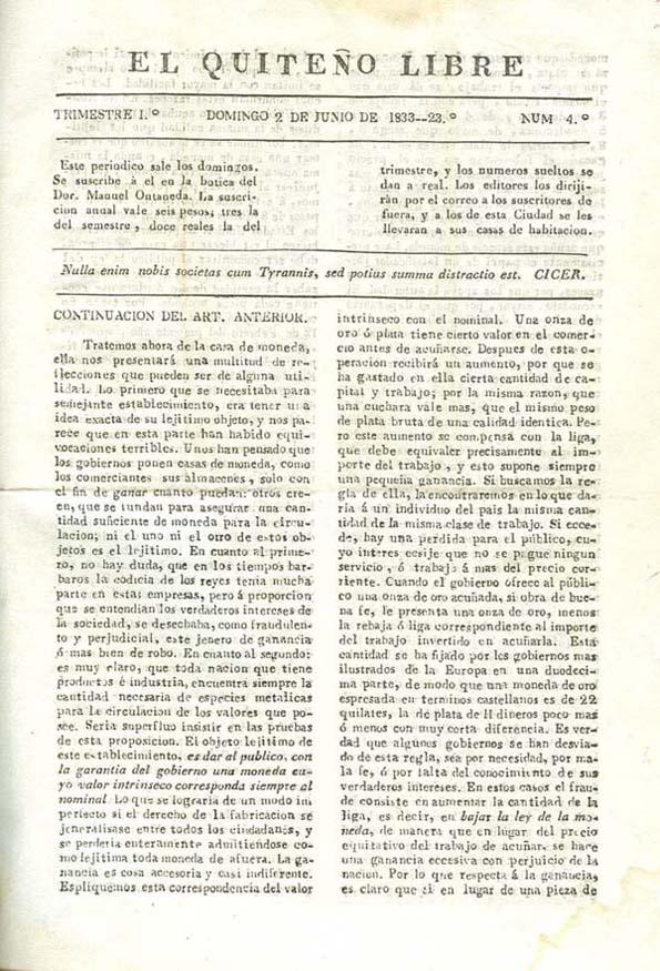 - Título: El quiteño libre. Año I, trimestre I, núm. 4, domingo 2 de junio de 1833 (en Formato HTML)