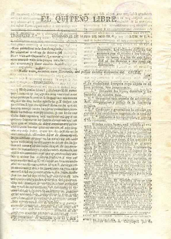 - Título: El quiteño libre. Año I, trimestre I, núm. 1, domingo 12 de mayo de 1833 (en Formato HTML)