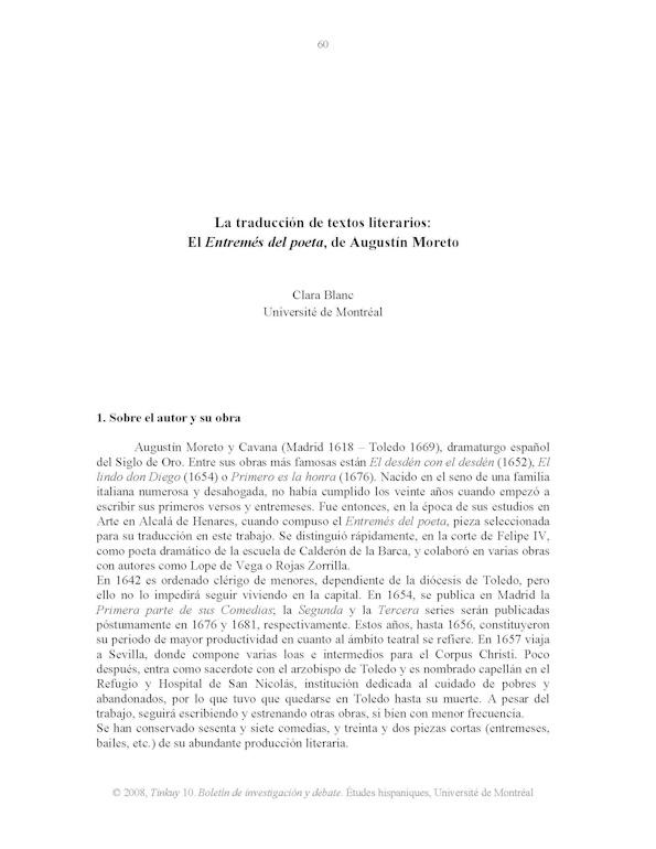 - Traducción francesa del "Entremés del poeta", de Agustín Moreto y su versión original en español
