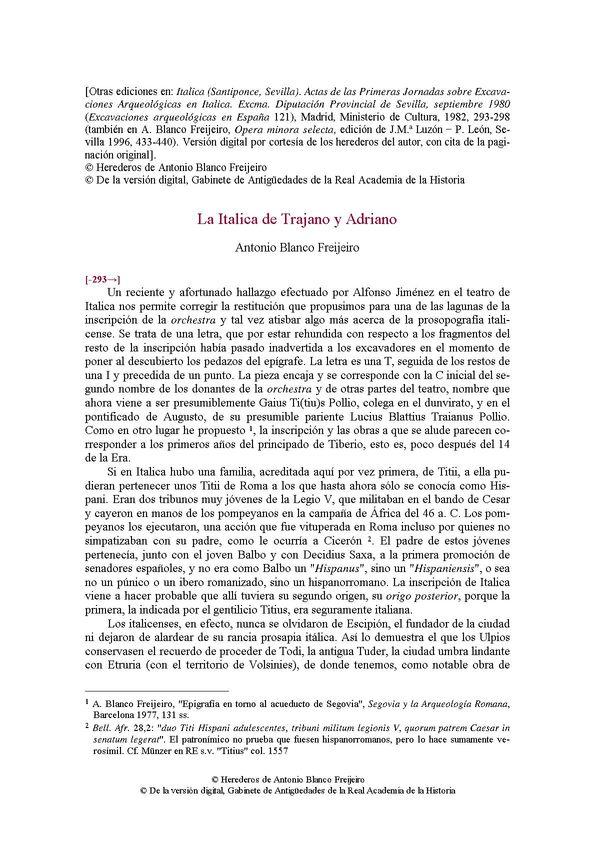 - Notas de reproducción original: Otra ed. en: Italica (Santiponce, Sevilla). Actas de las Primeras Jornadas sobre Excavaciones Arqueológicas en Italica ( Excma. Diputación Provincial de Sevilla, septiembre 1980) , Madrid, Ministerio de Cultura, 1982, 293-298 (Excavaciones arqueológicas en España 121) También en A. Blanco Freijeiro, Opera minora selecta, edición de J.M.ª Luzón - P. León, Sevilla 1996, 433-440. Versión digital por cortesía de los herederos del autor, con cita de la paginación original