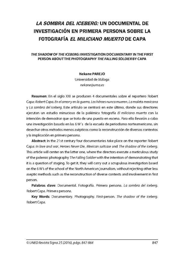 - Título: "La sombra del iceberg": un documental de investigación en primera persona sobre la fotografía "El miliciano muerto" de Capa / Nekane Parejo (Formato PDF)