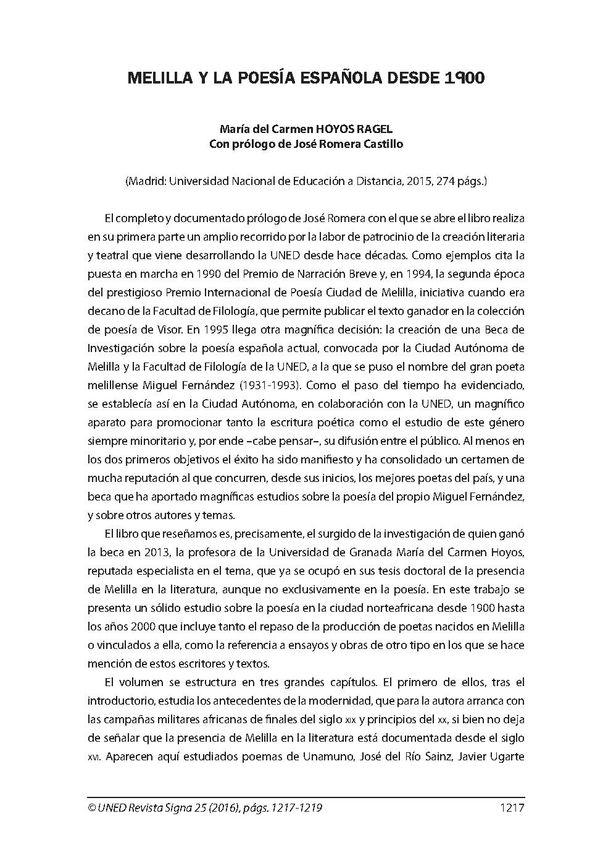 - Título: María del Carmen Hoyos Ragel: "Melilla y la poesía española desde 1900 (Con prólogo de José Romera Castillo)". Madrid: Universidad Nacional de Educación a Distancia, 2015, 274 págs. [Reseña] / Pilar Núñez Delgado (Formato PDF)