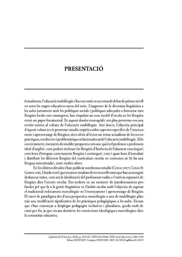 - Títol: Presentació del monogràfic «Retrat de l’educació multilingüe» / Laura Portolés, Pilar Safont (Format PDF)