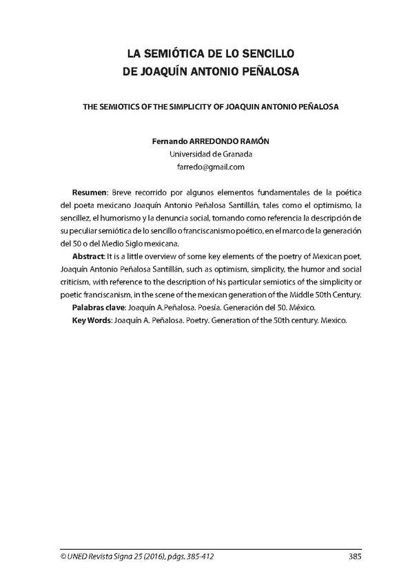 - Título: La semiótica de lo sencillo de Joaquín Antonio Peñalosa / Fernando Arredondo Ramón (Formato PDF)