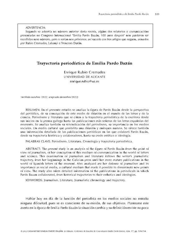 - Título: Trayectoria periodística de Emilia Pardo Bazán / Enrique Rubio Cremades (Formato PDF)