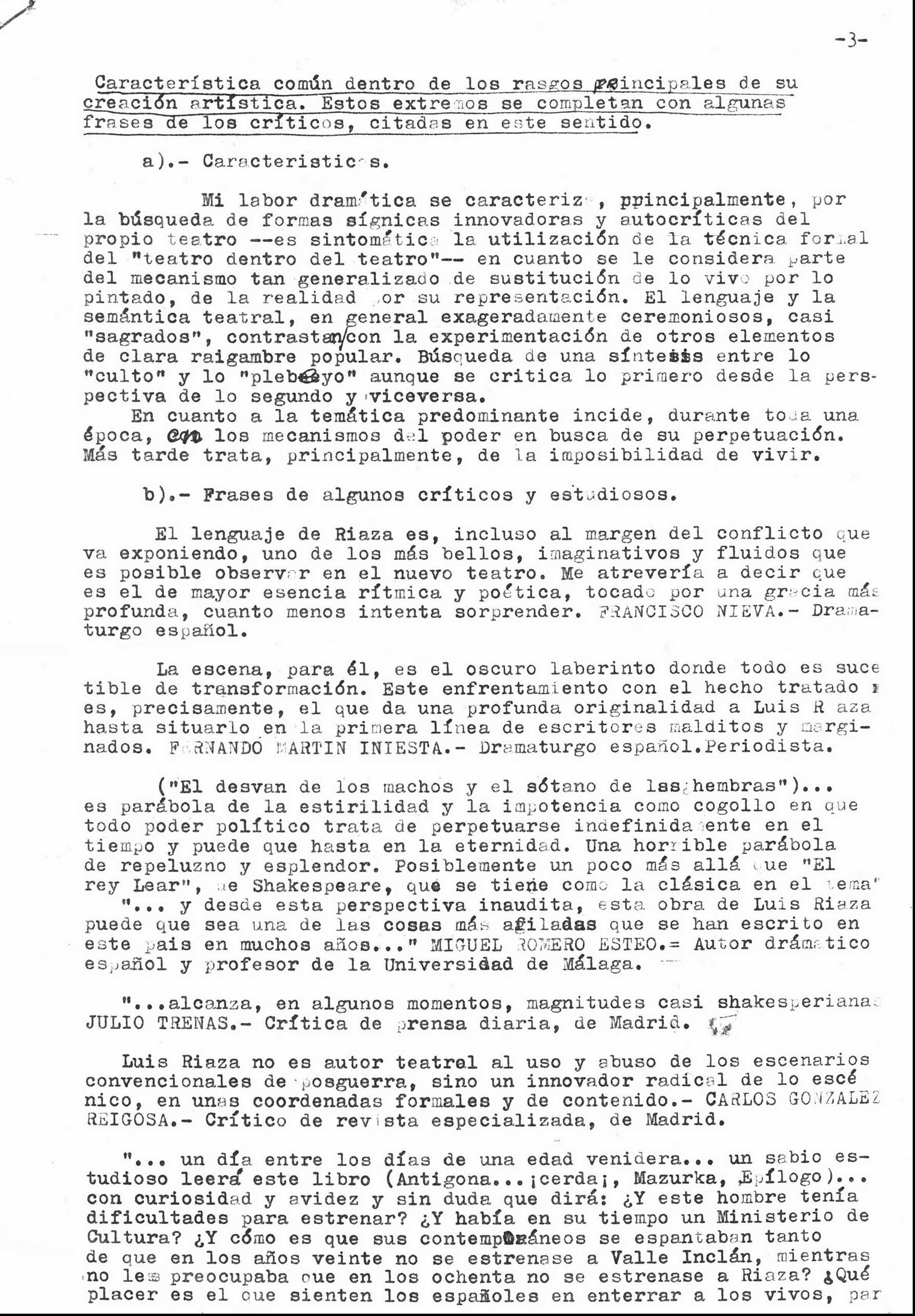 «... un día entre los días de una edad venidera ... un sabio estudioso leerá este libro (Antígona... ¡cerda!. Mazurka. Epílogo)... con curiosidad y avidez y sin duda que dirá: ‘¿Y este hombre tenía dificultades para estrenar? ¿Y había en su tiempo un Ministerio de Cultura? ¿Y cómo es que sus contemporáneos se espantaban tanto de que en los años veinte no se estrenase a Valle Inclán, mientras no les preocupaba que en los ochenta no se estrenase a Riaza? ¿Qué placer es el que sienten los españoles en enterrar a los vivos para luego desenterrar a los muertos?». DOMINGO MIRAS. Dramaturgo español.
