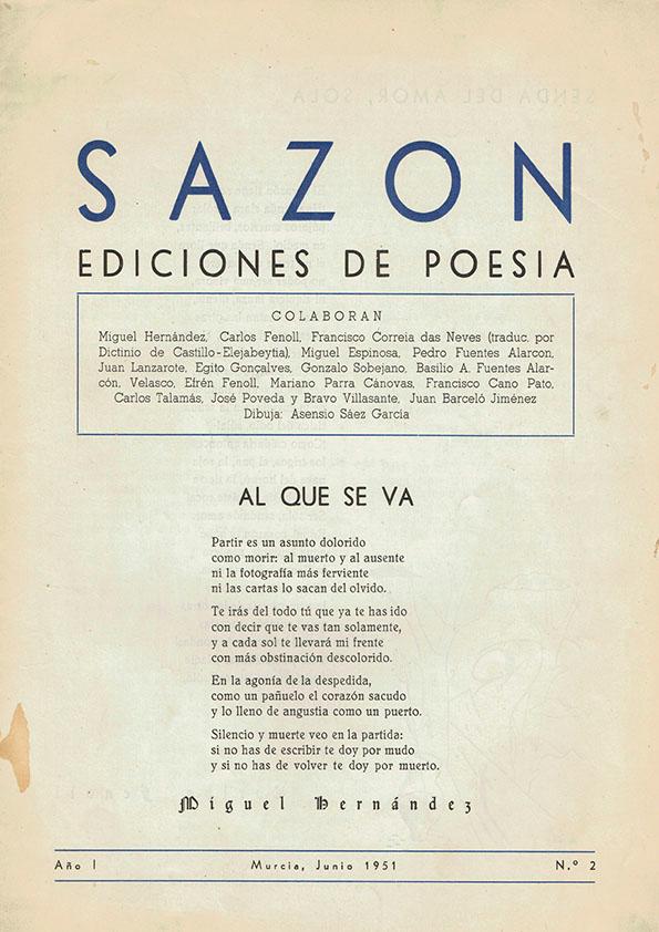 Edición digital a partir de Sazón: ediciones de poesía, año 1, núm. 2 (Murcia, junio 1951). -- Edición digital de la Biblioteca Virtual Miguel de Cervantes por cortesía de la Biblioteca Regional de Murcia