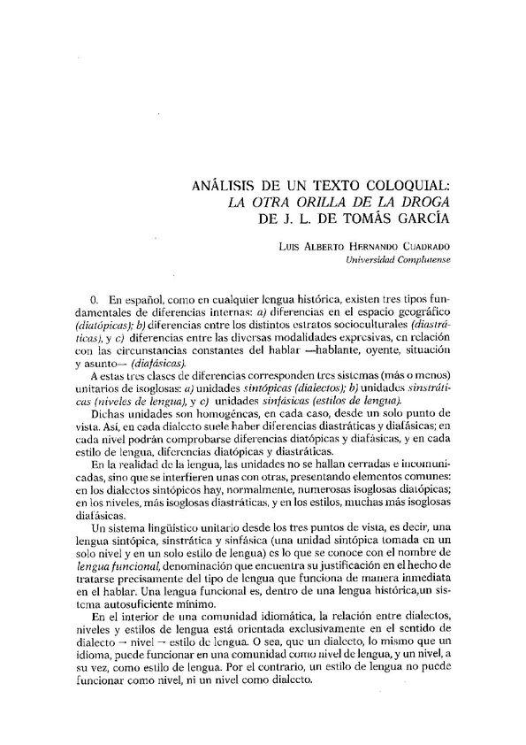 - Título: Análisis de un texto coloquial: "La otra orilla de la droga", de J.L. de Tomás García / Luis Alberto Hernando Cuadrado (Formato PDF)