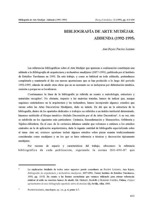 - Título: Bibliografía de arte mudéjar. Addenda (1992-1995) / Ana Reyes Pacios Lozano (Formato PDF)