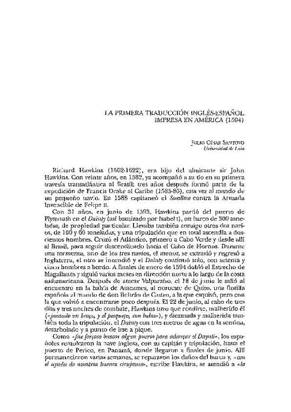 - Título: Carta de Richard Hawkins, en traducción anónima (1594). La primera traducción inglés-español impresa en América / Julio César Santoyo (Formato PDF)
