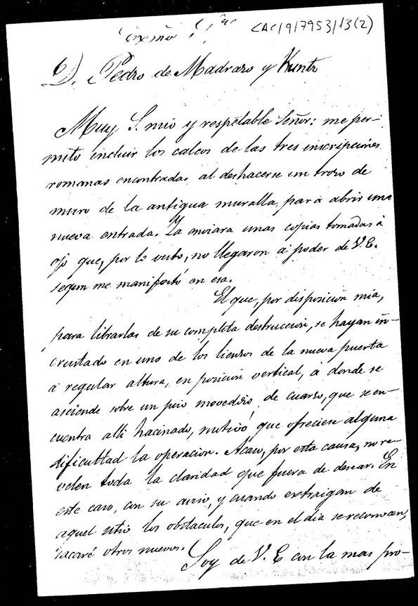 - Título: Carta en la que se informa del descubrimiento de tres inscripciones romanas en la muralla de Lugo, de las cuales se adjuntan calcos. (en Formato HTML)