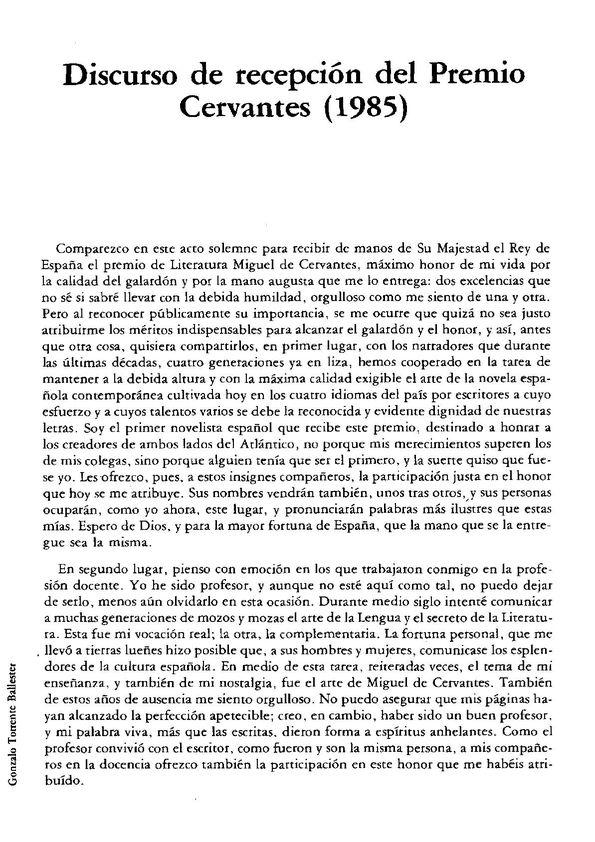 - Título: Discurso de recepción del Premio Cervantes (1985) / Gonzalo Torrente Ballester (Formato PDF)