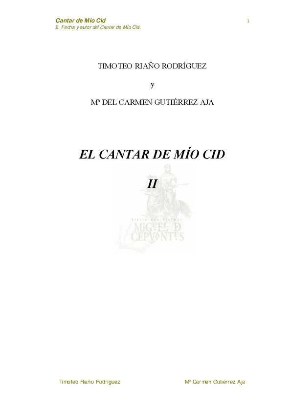 - Título: El Cantar de Mío Cid. 2 : fecha y autor del Cantar de Mío Cid / Timoteo Riaño Rodríguez y M.ª del Carmen Gutiérrez Aja (Formato PDF)
