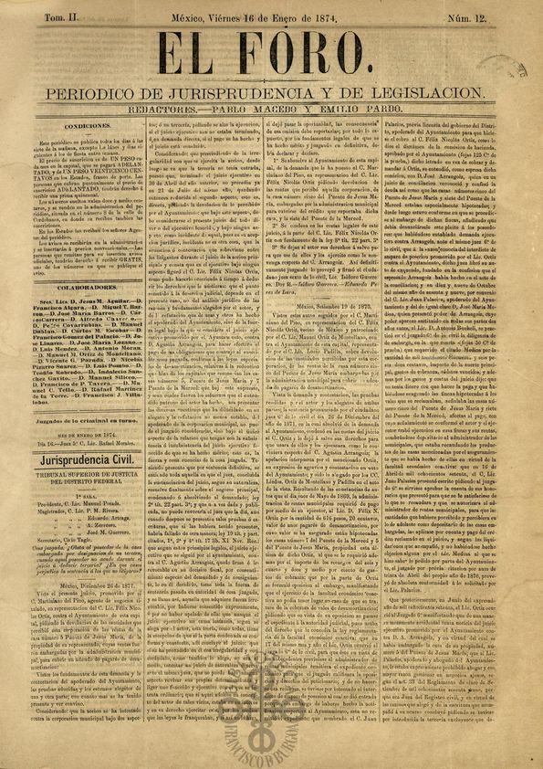 - Título: El Foro : Periódico de Jurisprudencia y Legislación. Tomo II, núm. 12, viernes 16 de enero de 1874 (Formato PDF)