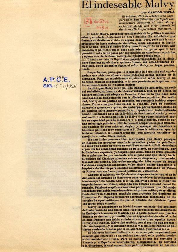 - Título: El indeseable Malvy / Por Carlos Esplá (Formato PDF)