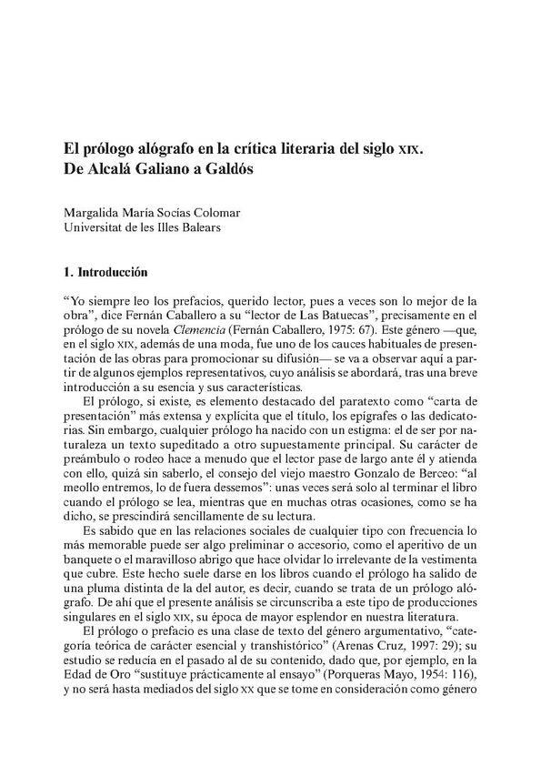 - Título: El prólogo alógrafo en la crítica literaria del siglo XIX. De Alcalá Galiano a Galdós por si tenía alguna duda / Margalida María Socías Colomar (Formato PDF)