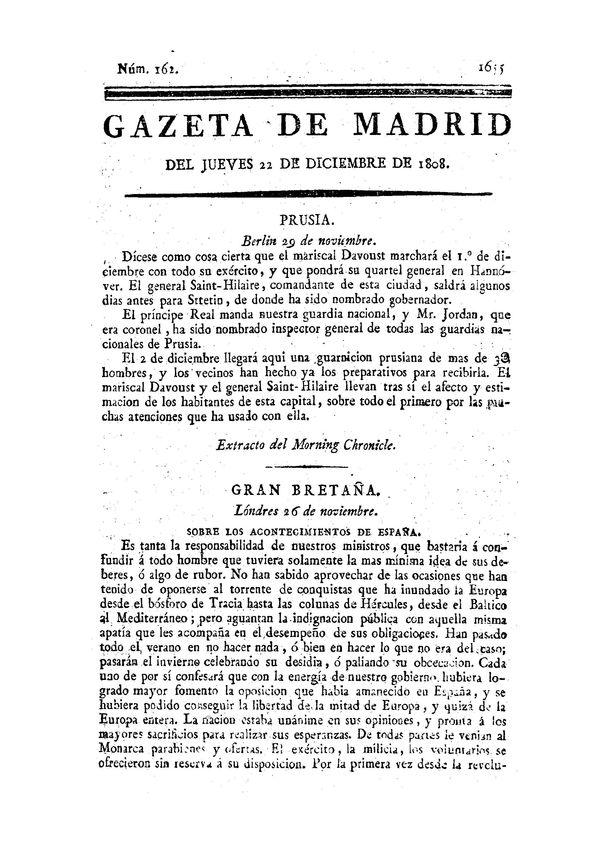 - Título: Gazeta de Madrid. 1808. Núm. 162, 22 de diciembre de 1808 (Formato PDF)