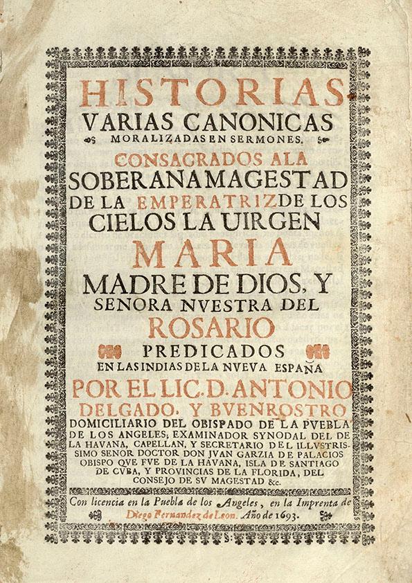 Historias varias canonicas moralizadas en sermones. Consagrados a la Soberana Magestad de la Emperatriz de los cielos la Virgen Maria madre de Dios, y Senora [sic] nuestra del Rosario predicados en las Indias de la Nueva España / por el Lic. D. Antonio Delgado, y Buenrostro domiciliario del obispado de Puebla de los Angeles, examinador synodal del de la Havana, capellan, y secretario del Illustrissimo Senor [sic] Doctor Don Juan Garzia de Palacios Obispo que fue de la Havana,...