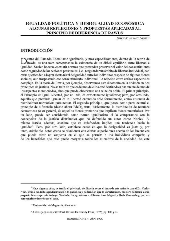 - Título: Igualdad Política y Desigualdad Económica. Algunas Reflexiones y Propuestas Aplicadas al Principio de Diferencia de Rawls (Formato PDF)