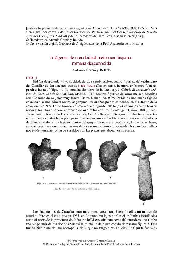 - Título: Imágenes de una deidad metroaca hispano-romana desconocida / Antonio García y Bellido (Formato PDF)