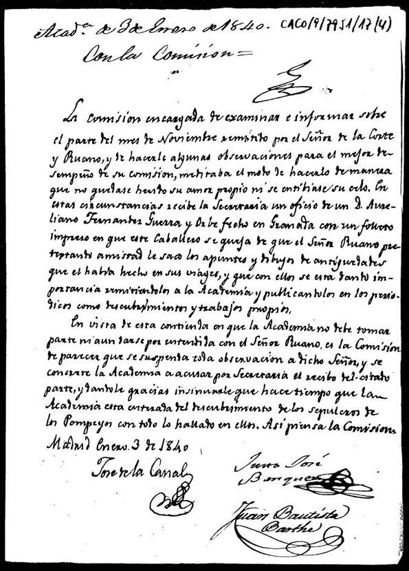 Informe sobre la comunicación de Aureliano Fernández-Guerra relativa al plagio del descubrimiento del sepulcro de los Pompeyos y la actitud que se debe tomar ante Manuel de la Corte y Ruano
