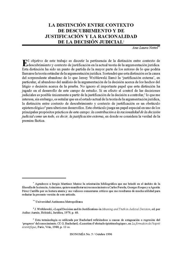 - Título: La distinción entre contexto de descubrimiento y de justificación y la racionalidad de la decisión judicial / Ana Laura Nettel (Formato PDF)