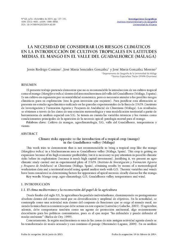 - Título: La necesidad de considerar los riesgos climáticos en la introducción de cultivos tropicales en latitudes medias. El mango en el valle del Guadalhorce (Málaga) / Jesús Rodrigo Comino, José María Senciales González, José María González Moreno (Formato PDF)