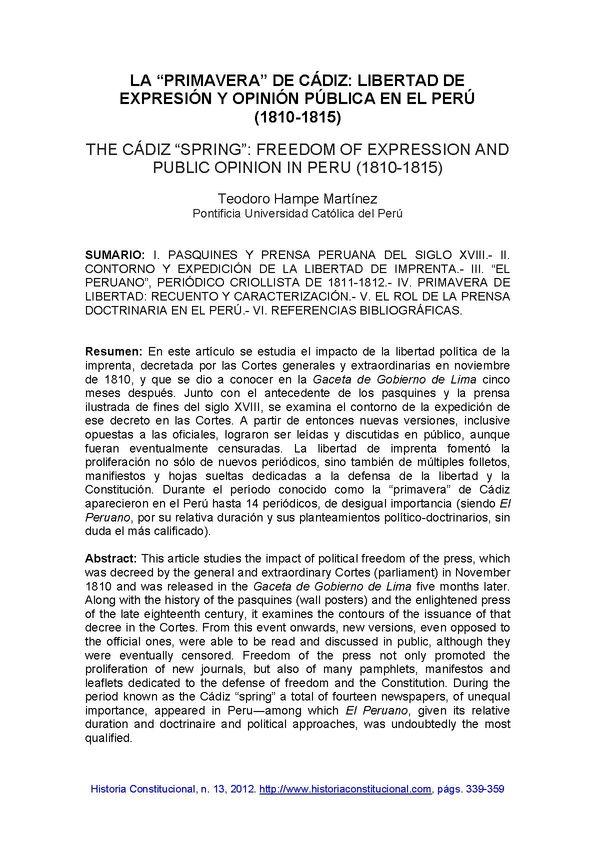 - Título: La "primavera" de Cádiz: libertad de expresión y opinión pública en el Perú (1810-1815) / Teodoro Hampe Martínez (Formato PDF)