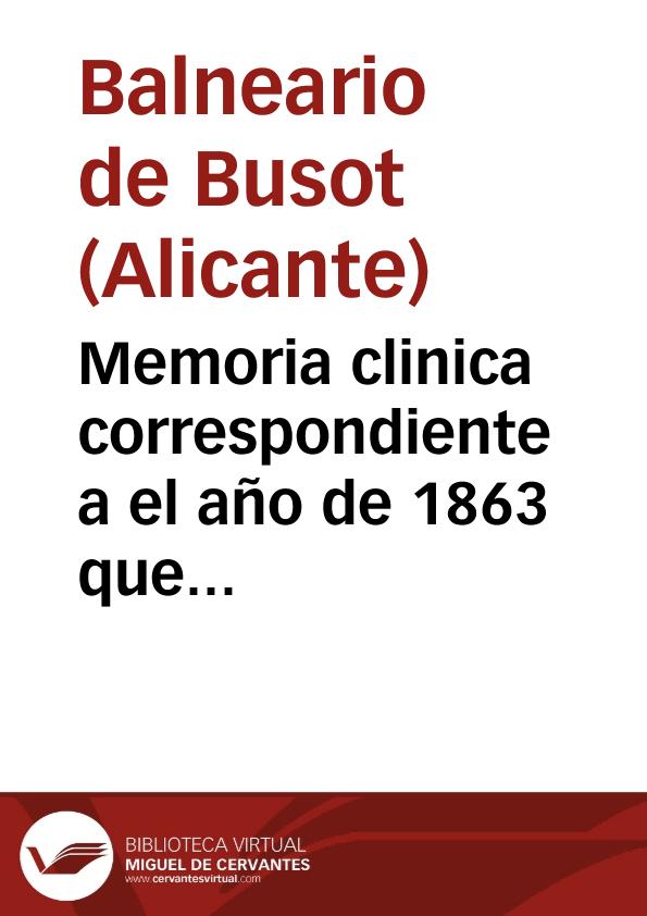 Memoria clinica correspondiente a el año de 1863 que eleba al Ecmo Sr. Director de Beneficencia y Sanidad del Reino / el Medico-Director por S.M. de las Aguas y Baños minero-medicinales de Busot Don Joaquin Fernandez Lopez.