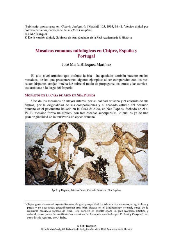 - Título: Mosaicos romanos mitológicos en Chipre, España y Portugal / José María Blázquez Martínez (Formato PDF)