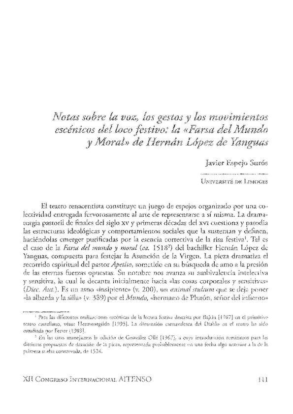 - Título: Notas sobre la voz, los gestos y los movimientos escénicos del loco festivo : la "Farsa del Mundo y Moral" de Hernán López de Yanguas / Javier Espejo Surós (Formato PDF)