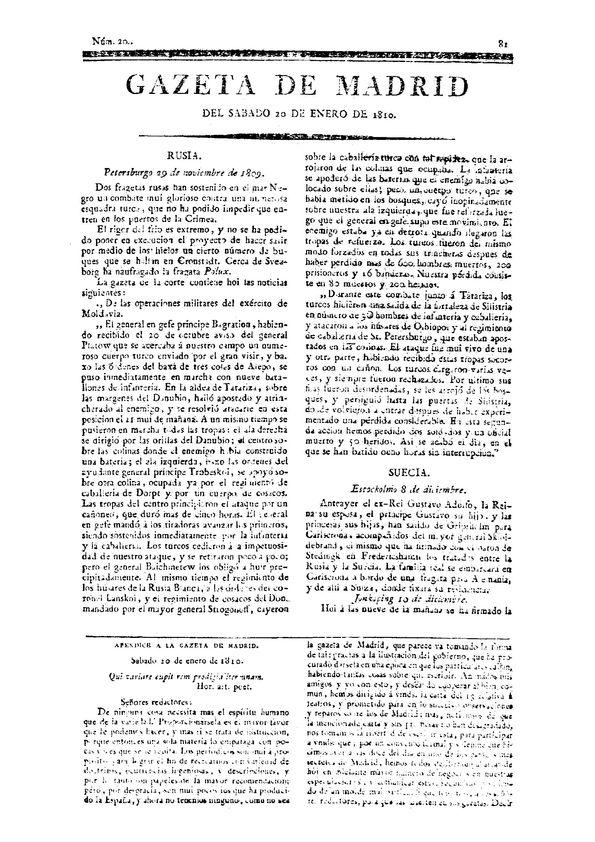 - Título: Gazeta de Madrid. 1810. Núm. 20, 20 de enero de 1810 (Formato PDF)