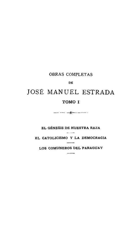 - Contiene: Noticia biográfica del Sr. Estrada por Juan M. Garro -- "El génesis de nuestra raza" - "El Catolicismo y la Democracia" - "Los comuneros del Paraguay"