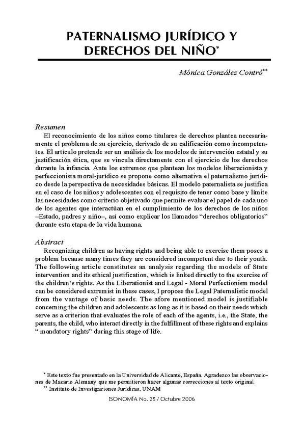 - Título: Paternalismo jurídico y derechos del niño / Mónica González Contró (Formato PDF)