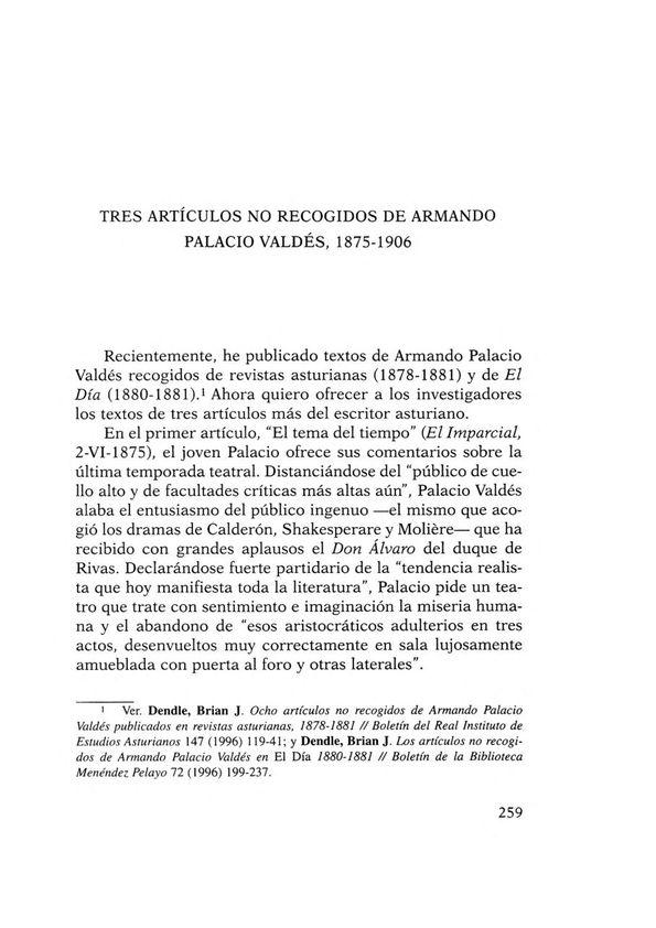 - Título: Tres artículos no recogidos de Armando Palacio Valdés, 1875-1906 / Brian J. Dendle (Formato PDF)